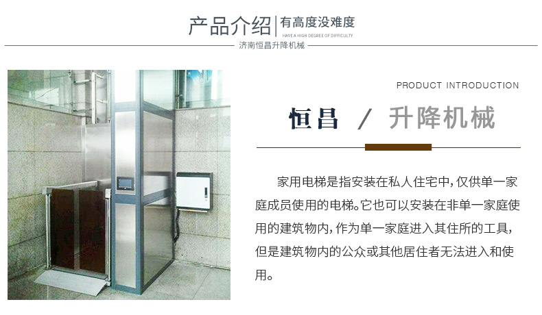 家用电梯是指安装在私人住宅中,仅供单一家庭成员使用的电梯。它也可以安装在非单一家庭使用的建筑物内,作为单一家庭进入其住所的工具,但是建筑物内的公众或其他居住者无法进入和使用。家用电梯额定速度不超过0.4m/s,对于无轿门的家用电梯额定速度不超过0.3m/s,轿厢行程不超过12m,额定载重量不大于400KG。主要分为曳引电梯,螺杆电梯,液压电梯等几种结构。